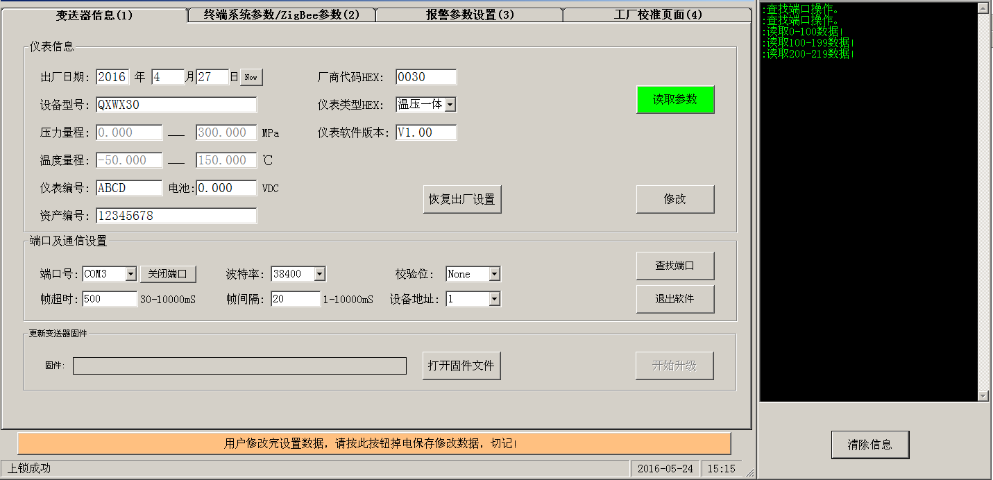 此页面主要显示变送器的出厂日期,设备型号,厂家代码,资产编号,温度或者压力的测量范围,还有本软件需要使用的端口设置信息。