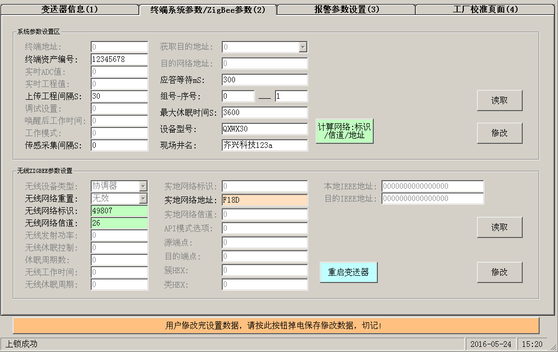 此页面主要设置变送器的采集,上传间隔,间隔时间,ZIGBEE网络的网络号,信道号,以及现场井名,还有根据井名称生成网络参数。所有参数设置完须执行写入操作,写入操作完毕之后须用户保存参数。网络参数设置完须重启变送器才可以启用本次设定的无线参数。