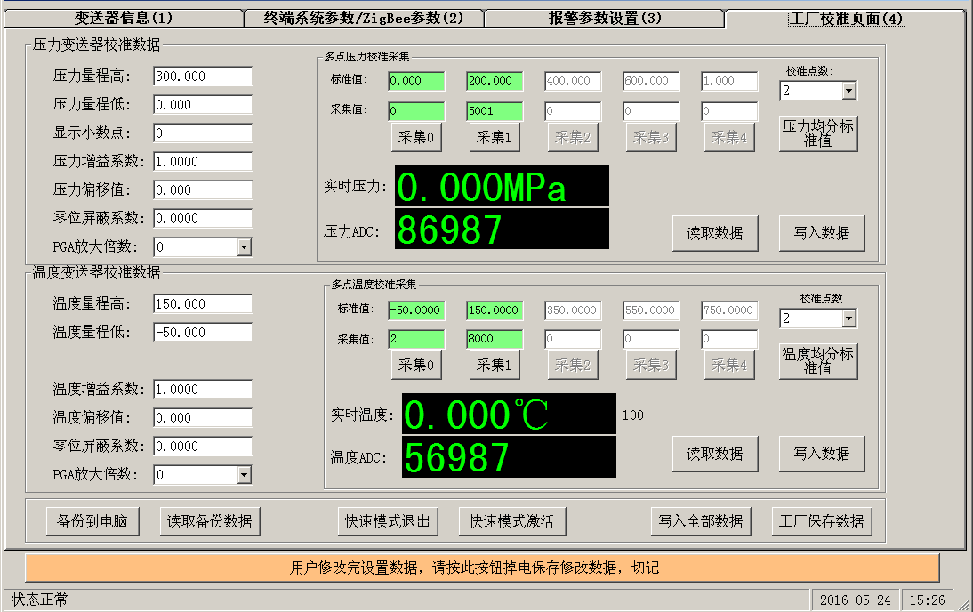 工厂校准页面主要是温度和压力的校准数据,此为工厂数据。工厂数据参数意义以及设置详细情况咨询常州天利,这里不做太多解释。需要特别说明的是本公司采用多点数据拟合算法,保证压力和温度传感器的数据准确性。可以根据变送器的类型,选择校准温度还是压力通道。工厂数据采集完毕需要写入操作,然后需要执行工厂保存操作数据才会被保存在变送器内部。