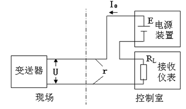 对于二线制变送器,同变送器连接的导线只有两根,这两根导线同时传输供电电源和输出信号,如图所示。可见,电源、变送器和负载电阻是串联的。二线制变送器相当于一个可变电阻,其阻值由被测参数控制。当被测参数改变时,变送器的等效电阻随之变化,因此流过负载的电流也变化。